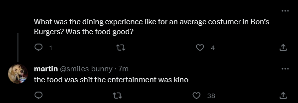 For the average Bon's Burgers customer, the food was terrible, but the entertainment was of a better quality.[7]