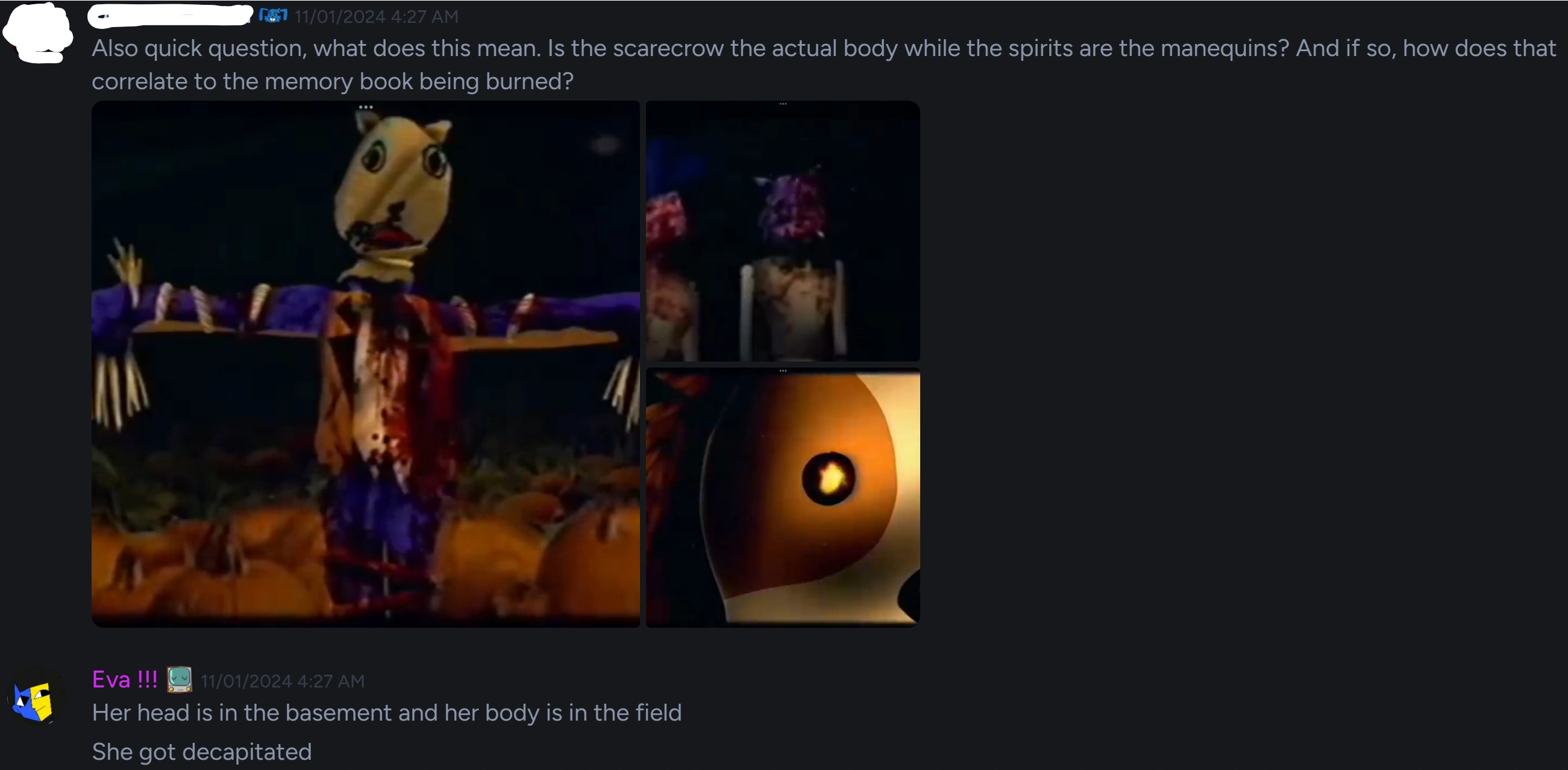 Tammy and Duckie is slightly expanded on in this episode. It is revealed that Tammy's Sister would tell the public about Tammy and Duckie going missing at the Waterman House, leading to the police investigation and later, the lynching of Pumpkin Rabbit and Witch Sheep.